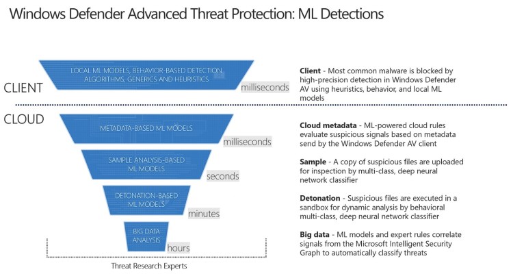 By augmenting expert human analysis, machine learning has driven an antimalware evolution within Windows Defender Antivirus, providing close to real-time detection of unknown, highly polymorphic malware. At the same time, machine learning has also enhanced how Windows Defender Advanced Threat Protection (Windows Defender ATP) is catching advanced attacks, including apex attacker activities that typically reside only in memory or are camouflaged as events triggered by common tools and everyday applications.