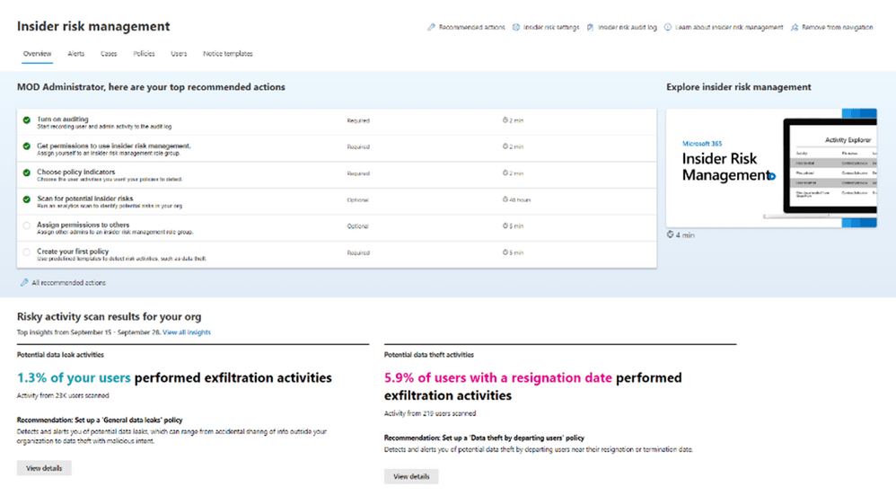 Microsoft Insider Risk Management helps organizations quickly identify and mitigate insider risks. Microsoft Purview Insider Risk Management is built with privacy by design. It empowers security teams to better understand what relevant data activities are the riskiest within their organization, create policies, and then investigate and mitigate these risks. Insider Risk Management is enhancing analytics with easy one-step policy creation. Now, admins can easily click “Create Policy” and use default thresholds to create a new insider risk policy.